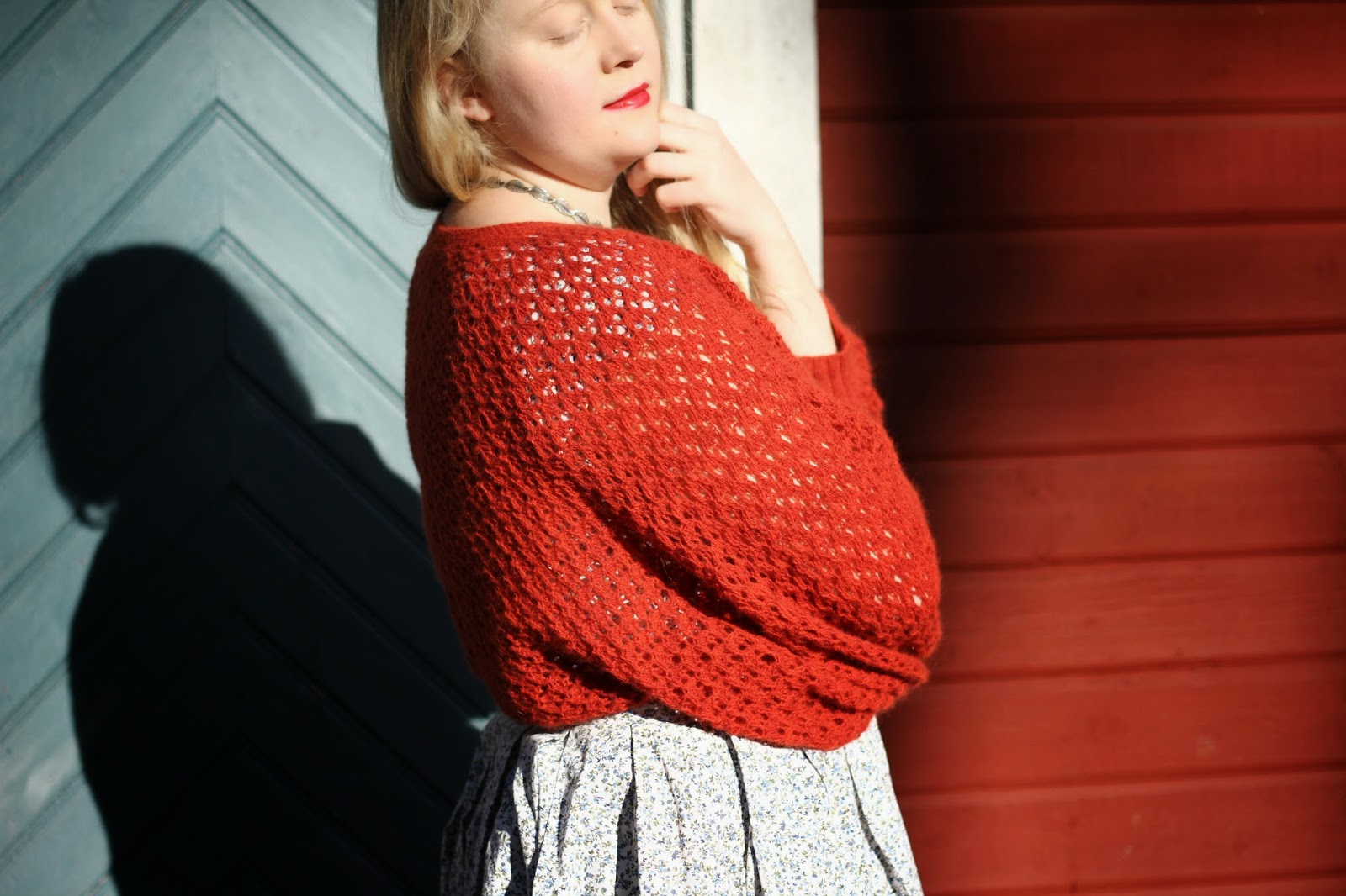 Koftan på bilderna är en Clara, stickad i Solkustens Spinnverkstads garn Jämtland, 2-trådigt. Den ska få följa med Ingrid på mässor så att ni kan känna på den och prova den på, men den är så mjuk och trevlig att ha på sig att jag har svårt att slitas från den. Kanske måste jag sticka en egen. Det gick åt fyra härvor till en medium och jag kan inte nog säga hur trevligt detta garn är, ni borde testa det. Jag använde stickor 4mm till koftan och 3,5mm till knapp- och halskanter.